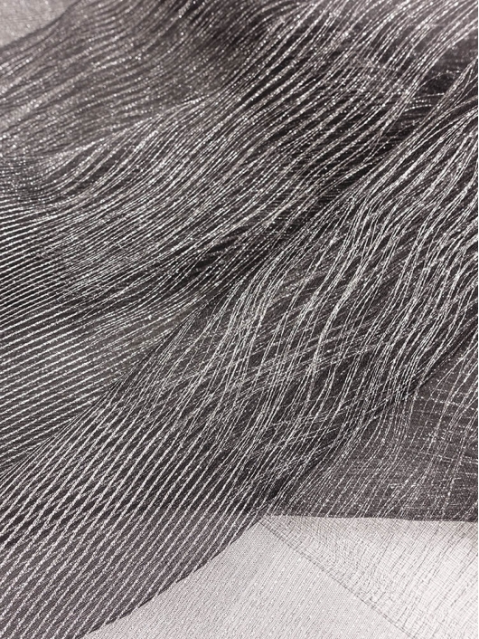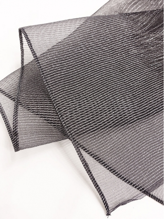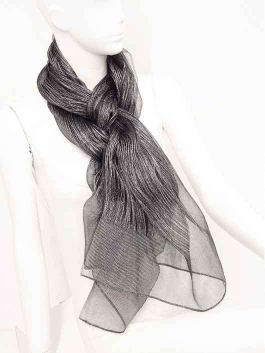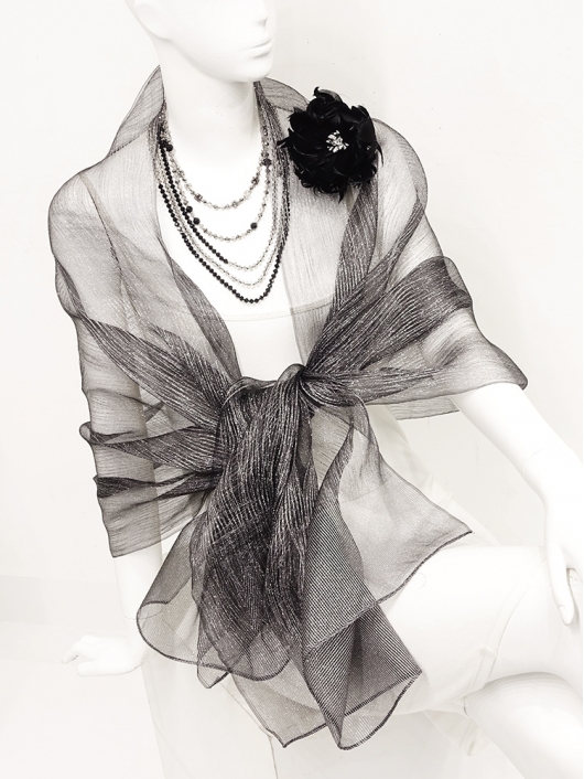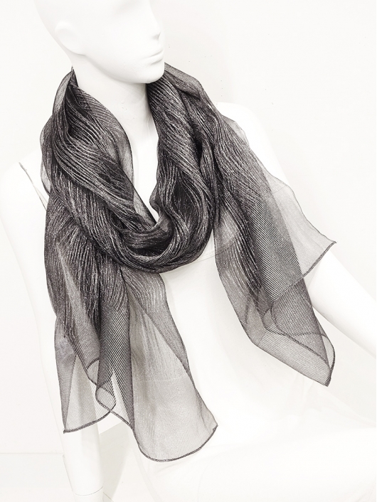 空気をふわりと織り上げたら、美しさが透き通るように重なり合う美しいストールになりました。まるで闇夜、月に照らされてキラキラと瞬き流れゆく大河の流れを描くように詩的な仕上がり…。羽織った瞬間にパッと華やぐラグジュアリーな魅力に溜息がでそうな一枚です。