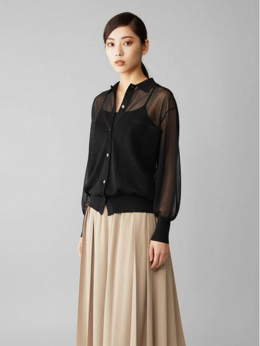 小顔効果抜群!きちんと感のあるトレンドライクな襟付きシアーニットカーディガン。