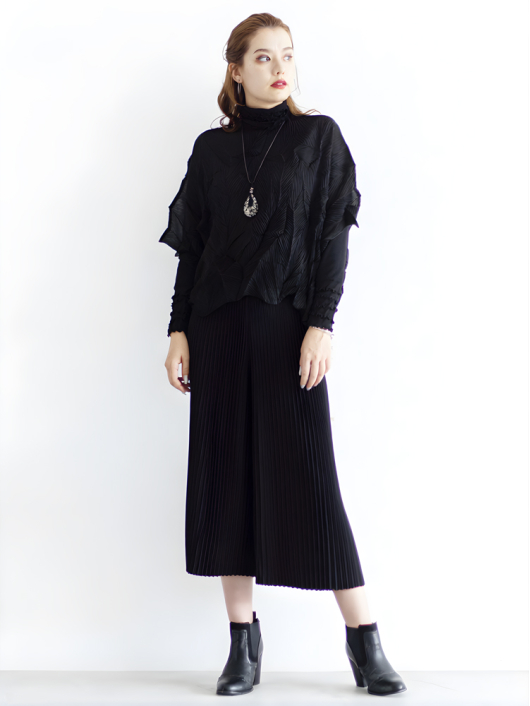 シャトルフェイドアウトプリーツ クロップドワイドパンツ ¥16,500 450ポイント還元 お気に入り登録数:12人 01 | 18 ツイード柄(黒白系) ズーム ※選択中のカラーの商品情報が表示されます ブラック ブラック Free/3~31号 ○ カートに入れる 商品説明 秋冬スタイルに欠かせないブーツ合わせにもちょうどいいワイド感と、抜け感のある丈感が意外なほど履きこなしやすいクロップドプリーツパンツ。 歩くたびに揺らめくフェイドアウトプリーツの立体感が、軽やかにカジュアルな魅力を引き立ててくれます。ショートレングスのシフォンプリーツをレイヤードしたプルオーバーともよく似合う丈感で、腰回りをすっきりと仕上げたデザインがさりげないアクセントに。ウエストは着心地のよいゴム仕様でフィット感を高め、トップスのフロントインもきれいに決まります。 ◆程よく広がるラインと大人の抜け感を演出する軽やかなクロップド丈は、黒一色でも何気なくドレッシー。一瞬で着映えるプリント系ジャケットともコーディネートしやすくて、デイリーはもちろん、旅先でのドレスアップも得意。お揃いになるジャケットとシンプルなトップスを合わせれば、一瞬できちんと感とリラックス感が程よい通勤スタイルに。足元はブーツからパンプスまで幅広く合わせられます。 商品詳細 プリーツの種類:シャトル フェイドアウトプリーツ対応サイズ:Free/3~31号重さ:238g生産国:中国素材:ポリエステル100%取り扱い:ドライ商品品番:431-301-40-09 商品の特徴 サイズガイドはこちら 【サイズ:平置き寸】 ウエスト65 ヒップ104 股上25 股下51 わたり幅34 裾幅33 レングス脇丈79 / 総丈79 ※単位:cm 【サイズの詳細:着用寸】 ウエスト:61~88cm(対応サイズ)・ヒップ:91~109cm・股上25cm・股下:51cm・わたり:34cm・裾幅:33cm・レングス:脇丈82cm / 総丈83cm 【商品の仕様】 ・シャトル フェイドアウトプリーツ製品 (縦横斜め全方向に伸縮性があります) ・ウエスト総ゴム仕様 ・ワイドシルエット ・クロップド丈 / 半端丈(7~8分丈) ◆Coordinate ・デイリー使いならゆるシルエットのツイントップスと合わせた大人カジュアルなスタイリングがおすすめ。 ・ミニマルなトップスやシャツをインして、ジャケットを羽織るだけで通勤などのオフィススタイルにも◎ ・ボリュームのある華やかなブラウスなどと合わせたスタイリングも素敵です。 ・お揃いになるジャケットとセットアップでの着用が可能です。 ・その他にも、相性の良いアイテムを揃えていますので多彩なクロスコーディネートを自由にお楽しみ頂けます。 ・足もとはサンダルやパンプス、スニーカーからブーツまで幅広く合わせていただけます。 *セットアップ対応商品は在庫切れの場合がございます。 【商品に対するご注意】 ※着用・お取り扱いの際は、商品についている品質表示とアテンションタグを必ずご確認下さい。 ※ゆとり感には個人差があります。サイズ表を確認の上、ご購入の目安としてご利用ください。 ※プリーツの形状や生地 / 仕様・デザインにより、着用感や実際のサイズ表に若干の誤差が生じる場合がございます。予めご了承ください。 ※単品の画像がない洋服/小物はスタイリングアイテムです。セットではないので、予めご了承下さい。 ※モデル撮影画像は、光の当たり具合で色味が違って見える場合があります。商品の色味はトルソー撮影の画像をご参照ください。 ※メーカー希望小売価格:¥16,500(税込) このアイテムを使ったコーディネート 身長:163cm 身長:163cm