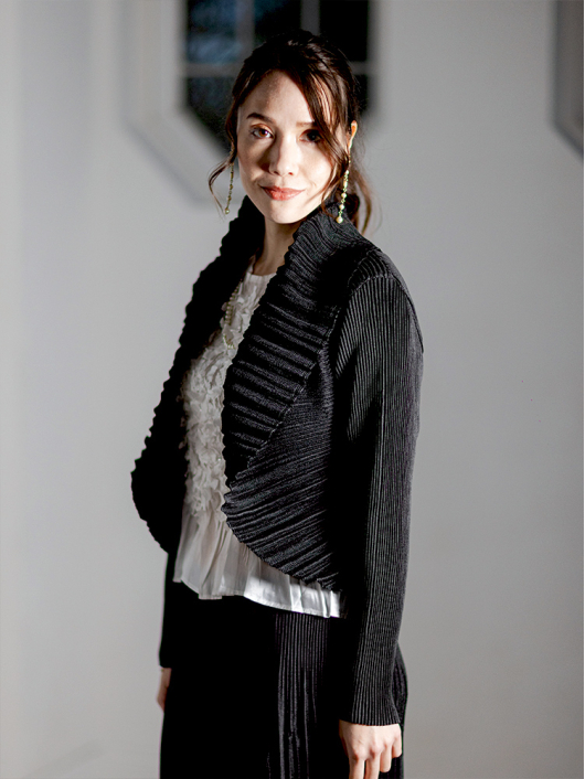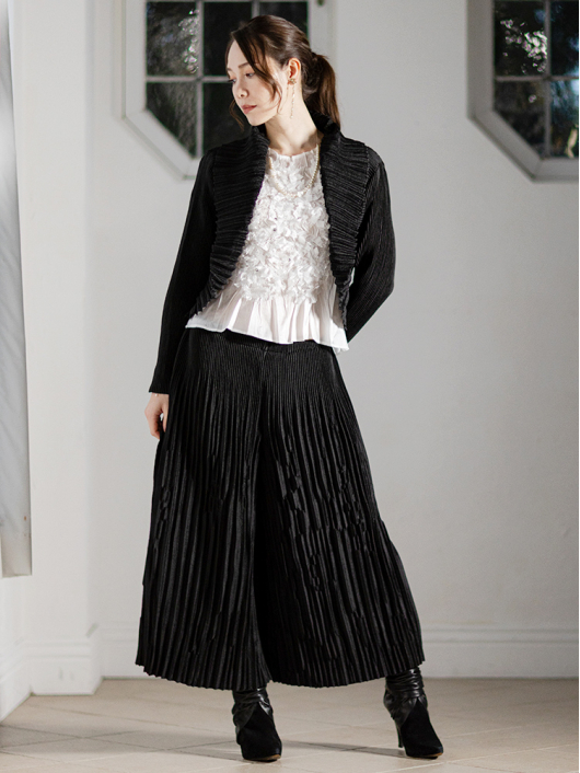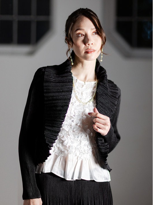立体的で美しいドラマティックなフェイドアウトプリーツジャケット。女らしさが香る華やかなショールカラーを大胆に彩る 意匠を凝らしたプリーツテクニックでシンプルなシルエットでもクチュール感ただよう1着に。光と影が織り成す繊細な陰影と立体感を湛えたプリーツの表情が素敵です。一方、前身頃のショルダー付近と袖、後ろ見頃は華奢さを意識させてスレンダーな印象の美しいシルエットに仕上げています。