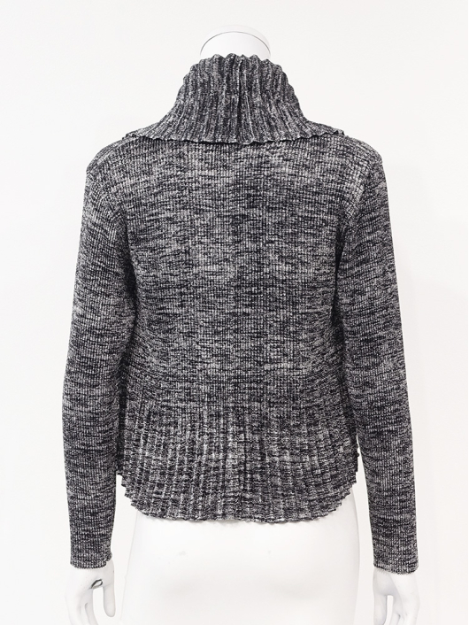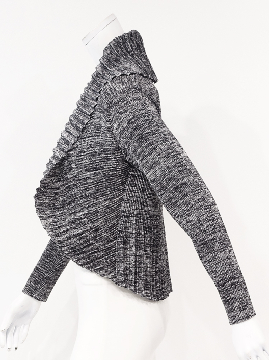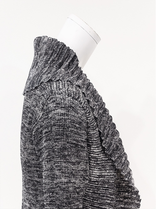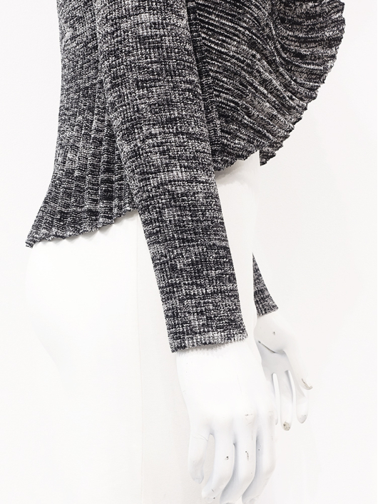 ・前後見頃に施した2度掛けシャトルプリーツが前襟ぐり~前端、後ろ裾に向かってフェイドアウトプリーツへと変化していくドラマティックなプリーツデザインです。