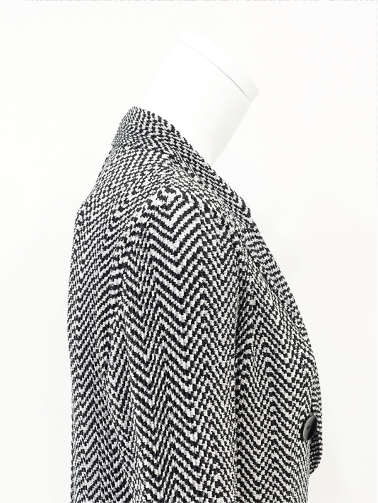 トレンドのピークドラペルに、身幅に程良くゆとりを持たせたダブルブレストデザインと、メンズライクなルックスを持ちつつ高め位置でウエストをやや絞った女性らしいシルエットが魅力です。すっきりと端正な印象を演出してくれるロング丈で着こなしやすさはもちろん、シルエットの邪魔にならないよう左右にフラップポケットを配して、かっちりしすぎない大人のモードスタイルに。トップスの上にさらりと羽織るだけで、ラフに前を開けても 締めても 颯爽とした着こなしがサマになります。