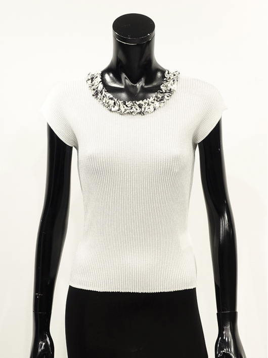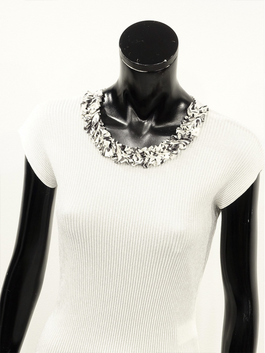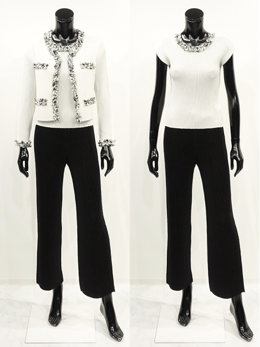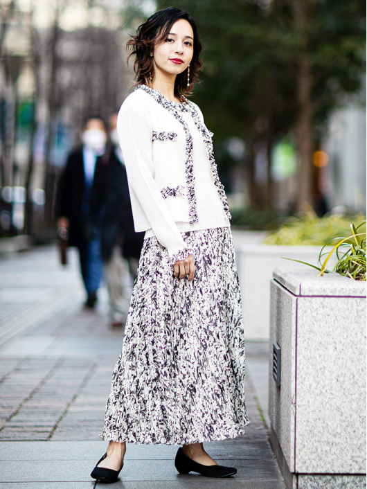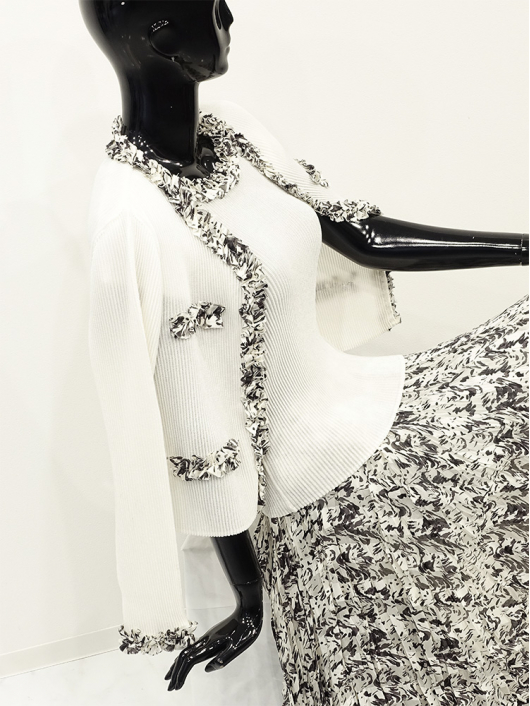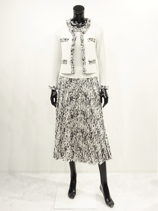 シフォンフリルトリミング ジャケットアンサンブル(ジャケット+トップス) ¥19,800 540ポイント還元 お気に入り登録数:27人 01 | 18 ツイード柄(黒白系) ズーム ※選択中のカラーの商品情報が表示されます オフホワイト×ハンドペイント柄 オフホワイト×ハンドペイント柄 △ カートに入れる 商品説明 程よく華やか、さりげなくきれい。ほんのりニュアンスが香るような かわいらしい大人の女性をイメージしたジャケットアンサンブルセット。単品使いができるのはもちろん、お仕事やちょっとしたお出かけにも使いやすく、様々なスタイルに馴染んで幅広く着こなせる表情に仕上げています。旅先のドレスアップにもおすすめです。 ■ジャケット ハンドペイント柄のシフォン素材のギャザーフリルを襟ぐり~前端、飾りポケット、袖口にあしらい、シンプルなノーカラーデザインでチャーミングさを際立たせています。トップスの上から軽くさらっと羽織れるコンパクトなシルエットや丈感がオフィスにもよく似合うきちんと感のある印象に。 ■トップス ジャケットを脱いでも絵になる、コンパクトなシルエットが美しいきれいめトップス。襟元にジャケットとお揃いのトリミングを配したチャーミングなギャザーフリルデザインは、甘くなりすぎず、顔まわりはもちろん、シンプルな装いも華やかに演出してくれます。 【COORDINATE】 お揃いになるシフォン素材でお作りしたスカートとセットアップでそろえればフォーマルな場にも映える「きちんと感」を備えた素敵な着こなしが完成します。学校行事や謝恩会・同窓会・結婚式・披露宴・二次会のお呼ばれなど「晴れの日」スタイルにも最適です。トレンドのワイドシルエットのセンタープレスやタックパンツ、カジュアルなジーンズスタイルにもフィット。オケージョン以外でもさまざまなデイリーシーンで活躍してくれます。 商品詳細 プリーツの種類:シャトルプリーツ対応サイズ:Free/3~31号重さ:276g生産国:中国素材:ポリエステル100% 別布フリル部分:ポリエステル100%取り扱い:ドライ商品品番:431-711-40-51 商品の特徴 サイズガイドはこちら 【サイズ:平置き寸】 アウタージャケット バスト82 肩幅35 袖丈53 着丈45 インナートップス バスト64 裄丈19 着丈50 ※単位:cm ■サイズの詳細・着用寸:アンサンブルセット(3WAY仕様 / 単品使いも出来ます) アウター:バスト74~124cm(対応サイズ)・肩幅39cm・袖丈55cm・着丈46cm・重さ181g インナー:バスト74~124cm・裄丈24cm・着丈51cm・重さ95g 【素材・加工】 ・シャトルプリーツ製品 (縦横斜め全方向に伸縮性があります) 【商品の仕様】 ◆アウタージャケット / オフホワイト色 ・プリントシフォンフリルトリミング刺繍デザイン ・ノーカラータイプ ・オープンフロント(留め具なし) ・セットインスリーブ ・ショート丈(ウエストラインにかかるくらいの丈感です) ・フリル部分…衿ぐり/前端/袖口/飾りポケット ◆インナートップス / オフホワイト色 ・ラウンドネックライン ・前襟ぐりプリントシフォンフリル刺繍 ・ドロップショルダー ・フレンチスリーブ ・ヒップにかかるくらいの丈感です ◆セットアップ対応◆ シフォン素材がお揃いになる別売りのプリーツスカートと合わせてツーピース / スリーピーススーツとしての着用が可能です。ビジネスからセレモニー / パーティフォーマルまで幅広い用途に活躍するアイテムです。 *セットアップ対応商品は在庫切れの場合がございます。 【商品に対するご注意】 ※取り扱いについては、商品についている品質表示でご確認ください。 ※ゆとり感には個人差があります。サイズ表を確認の上、ご購入の目安としてご利用ください。 ※プリーツ生地や仕様・デザインにより、着用感や実際のサイズ表に若干の誤差が生じる場合がございます。予めご了承ください。 ※単品の画像がない洋服/小物はスタイリングアイテムです。セットではないので、予めご了承下さい。 ※モデル撮影画像は、光の当たり具合で色味が違って見える場合があります。商品の色味はトルソー撮影の画像をご参照ください。 ※メーカー希望小売価格:¥19,800(税込) このアイテムを使ったコーディネート 身長:155cm