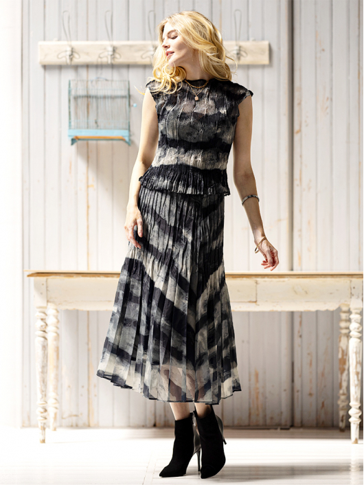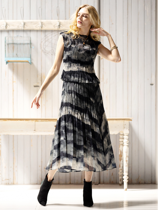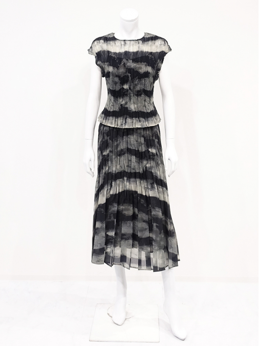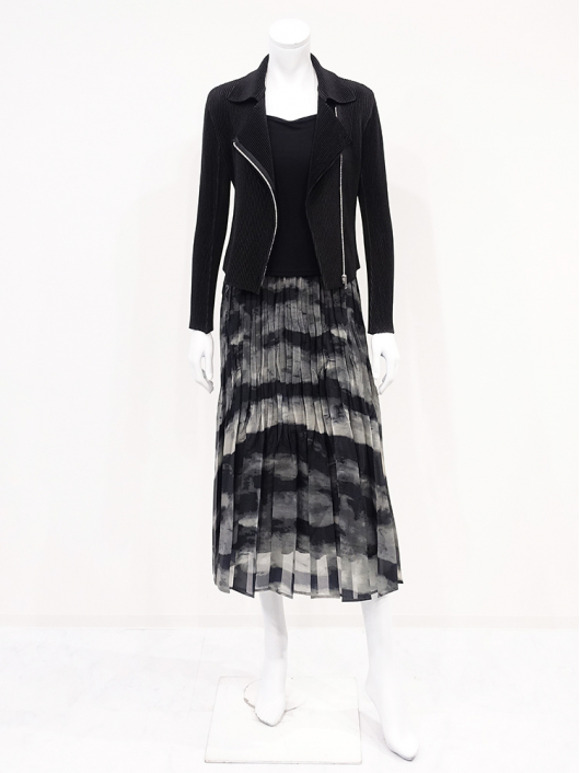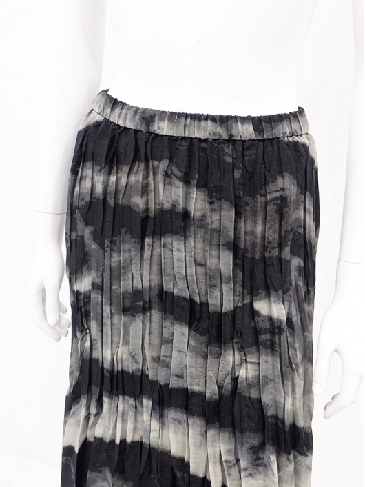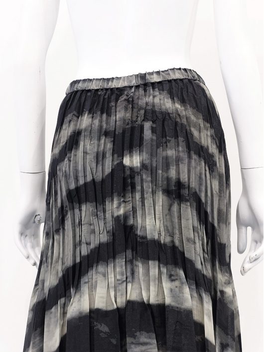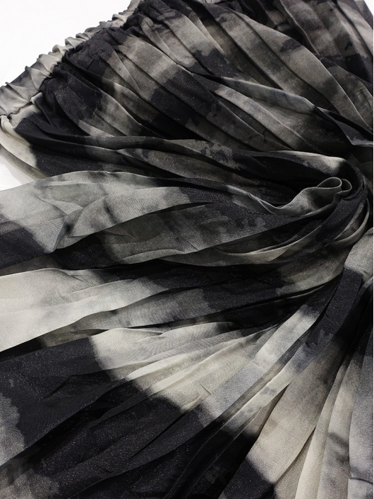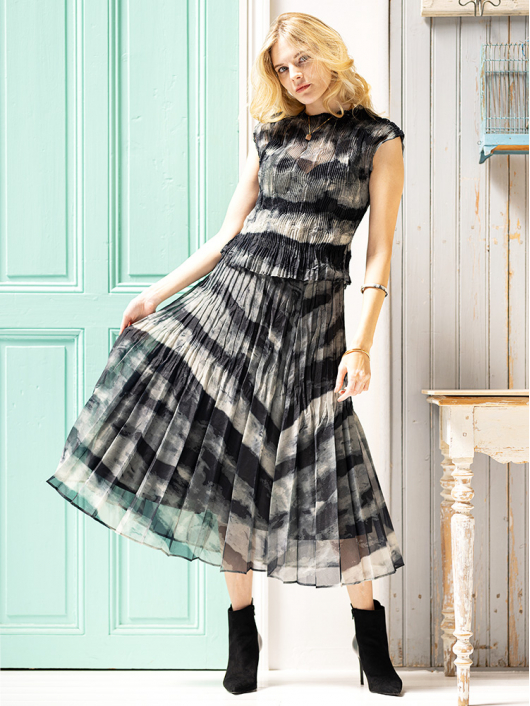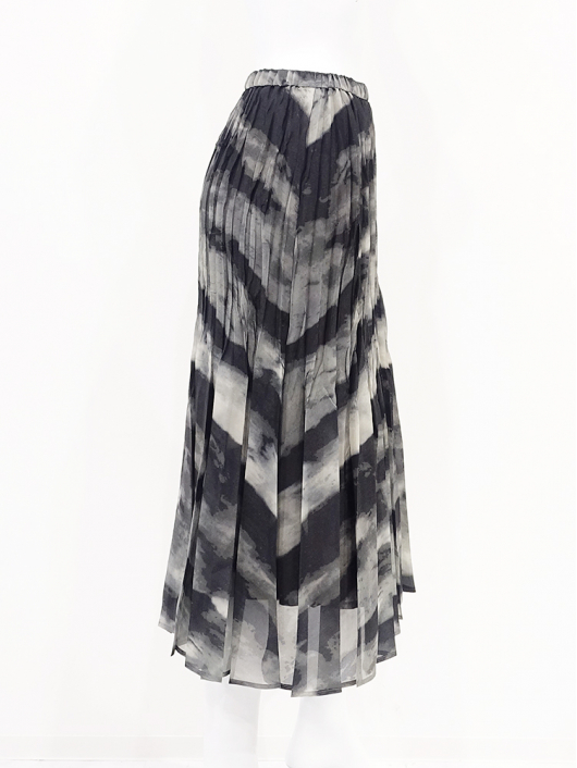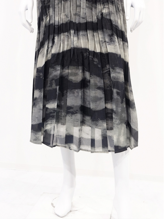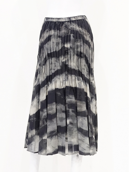 ブラックカーキの大胆なニュアンス系プリントとドラマティックなシルエットが印象的なプリーツスカート。