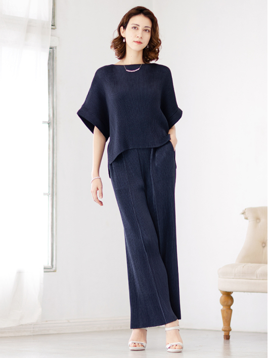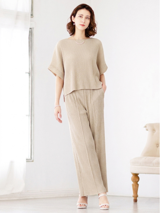 オフィス映えはもちろん、ちょっとお出かけするときも、きちんと見える「スタイリッシュな大人のイージーパンツ」がシャトルプリーツに新登場!ストレートシルエットの上品なワイドパンツは、着丈バランスと程良い太さに拘った美脚シルエット。スラリとしたかっこ良さが際立つセンターライン入りで、前も後ろ姿も綺麗に見せてくれる上に、すっきりと端正な印象を演出してくれます。体型を気にせずはけて、楽ちんながら履くだけでスタイルアップして見えるので、大人の女性にお薦めのアイテムです。