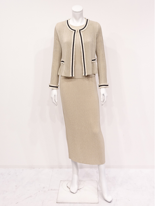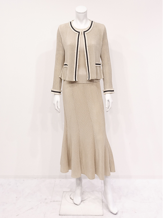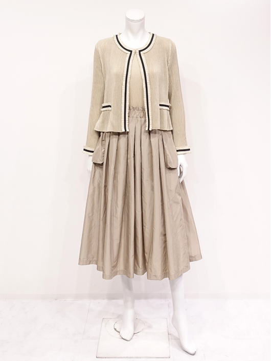 リボントリミング シャトルジャケット ¥16,500 450ポイント還元 お気に入り登録数:38人 01 | 18 ツイード柄(黒白系) ズーム ※選択中のカラーの商品情報が表示されます ベージュ系 ベージュ系 Free/3~31号 △ カートに入れる 商品説明 シフォンのアコーディオンフリルに配色のグログランリボンを重ねて、フェミニンなアクセントを効かせたトリミングジャケット。形はキレイめ、甘くなりすぎず、ラフに羽織るだけでもリボンテープの量感がスタイルをより魅力的に引き立ててくれます。日常にも馴染みの良い「大人の可愛らしさ」をセンスよく着こなせる雰囲気を持っているので、デイリーにはもちろん、オケージョンにも使いやすく、旅先でも重宝する一着です。 PRESS RELEASE|ドラマ衣装 ▼TBSドラマ 「海に眠るダイヤモンド」第1話・第3話 宮本信子さんに着用して頂いております。 商品詳細 プリーツの種類:シャトルプリーツ対応サイズ:Free/3~31号重さ:198g生産国:中国素材:ポリエステル100% 別布:ポリエステル100%取り扱い:ドライ商品品番:441-402-40-02 商品の特徴 サイズガイドはこちら 【サイズ:平置き寸】 バスト88 肩幅36 袖丈55 着丈49 ※単位:cm 【サイズの詳細:着用寸】 バスト 74~124ccm(対応サイズ)・肩幅39cm・袖丈57cm・着丈50cm 【商品の仕様】 ・シャトルプリーツ製品(縦横斜め全方向に伸縮性があります) ・配色リボントリミングデザイン (襟ぐり~前端、飾りポケット、袖口にあしらい大人によく似合うフェミニンな華やかさを表現しています。) ・ノーカラーネックライン ・前中心ホック開き ・セットインスリーブ ・裾はふわりと揺れるフレアシルエット ・ショート丈(ウエストラインが隠れるくらいの丈感です) ・お揃いになるトップスやボトムス、ワンピースを揃えていますので多彩なクロスコーディネートを自由にお楽しみ頂けます。 【商品に対するご注意】 ※着用・お取り扱いの際は、商品についている品質表示とアテンションタグを必ずご確認下さい。 ※ゆとり感には個人差があります。サイズ表を確認の上、ご購入の目安としてご利用ください。 ※プリーツの形状や生地 / 仕様・デザインにより、着用感や実際のサイズ表に若干の誤差が生じる場合がございます。予めご了承ください。 ※単品の画像がない洋服 / 小物はスタイリングアイテムです。セットではないので、予めご了承下さい。 ※モデル撮影画像は、光の当たり具合で色味が違って見える場合があります。商品の色味はトルソー撮影の画像をご参照ください。 ※メーカー希望小売価格:¥16,500(税込) このアイテムを使ったコーディネート 身長:168cm