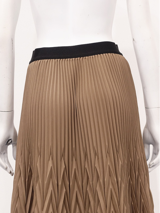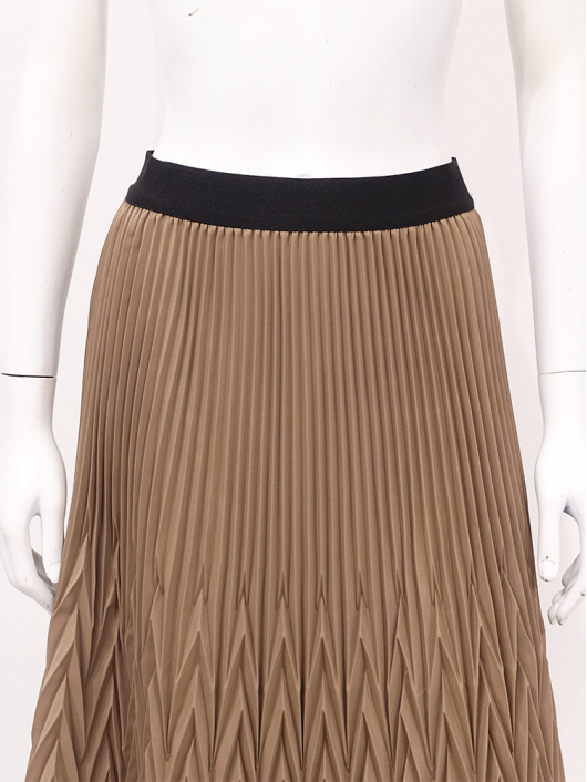 繊細で女らしい印象を与えてくれる細めのアコーディオンからヘリンボーンへとプリーツが流れるように切り替わるドラマティックなデザインは、シンプルなトップスと合わせるだけでスタイルアップ効果大。広がりすぎず落ち感が綺麗なロング丈に、Aラインシルエットで立ち姿もすっきり。陰影のあるプリーツが歩く度に軽やかに揺れ女性らしいニュアンスを引き立たせてくれます。ブラックカラーで引き締めるウエストのゴムベルトもさり気ないポイント。デイリーにはもちろん、お呼ばれや帰省 / 旅先でのドレスアップアイテムとしてもお薦めです。