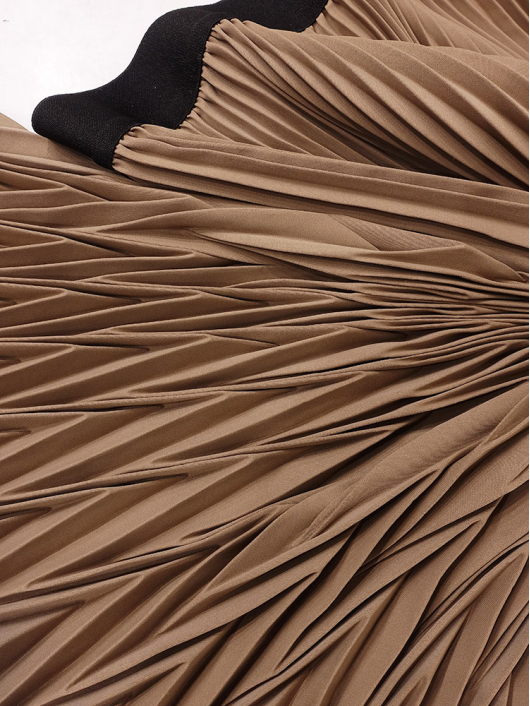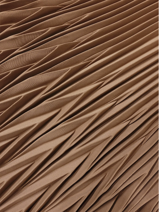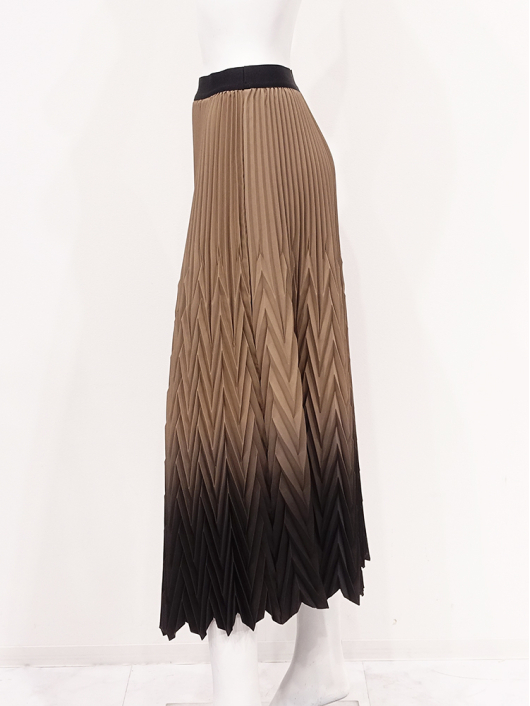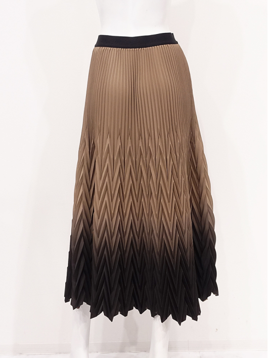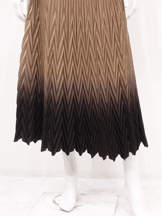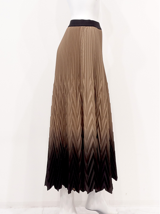 キャメルベージュから裾に向かって優しげに色彩が移り変わるダークトーンの滲みやブラウンに潜む甘さに惹かれるグラデーションプリントのプリーツスカート。シンプルなコーディネートに大胆に映える美しい図案と色彩は、きれいめにまとめても、カジュアルに着くずしても◎