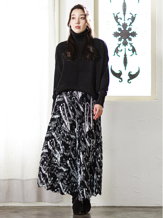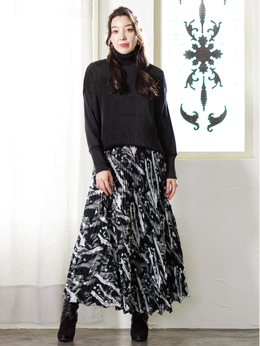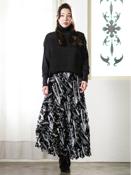 アコーディオンヘリンボーンプリーツスカート ¥19,800 540ポイント還元 お気に入り登録数:2人 01 | 18 ツイード柄(黒白系) ズーム ※選択中のカラーの商品情報が表示されます ペイント柄(モノトーン系) ペイント柄(モノトーン系) 40号 △ カートに入れる 商品説明 一点投入で主役級の存在感に惹かれるプリーツスカート。広がりすぎず落ち感が綺麗なロング丈に、Aラインシルエットで立ち姿もすっきり。モノトーンで描く大胆なペインティング柄にのせた陰影のあるプリーツが歩く度に軽やかに揺れ女性らしいニュアンスを引き立たせてくれます。 アコーディオンからヘリンボーンへとプリーツが流れるように切り替わるドラマティックなデザインは、シンプルなトップスと合わせるだけでスタイルアップ効果大。穿くだけで着こなしが映えるインパクトを持っているので特別な日にもぴったりな理想の一着!デイリーにはもちろん、お呼ばれや帰省 / 旅先でのドレスアップアイテムとしてもお薦めです。 商品詳細 プリーツの種類:アコーディオンヘリンボーンプリーツ対応サイズ:Free/3~23号重さ:295g生産国:中国素材:ポリエステル100% ベルト部分:ポリエステル85% ポリウレタン15%取り扱い:ドライ商品品番:442-275PRT-40-59 商品の特徴 サイズガイドはこちら 【サイズ:平置き寸】 ウエスト65 ヒップー スカート丈82 ※単位:cm 【サイズの詳細:着用寸】 ウエスト:61~96cm(対応サイズ)・ヒップ:91~113cm・スカート丈:84cm 【商品の特徴】 ・パウダリーサテン素材(上品な印象を持つマットな質感と肌離れのいいさらっとした感触です ) ・ペイント柄プリント(モノトーン系) ・ウエストゴムベルト仕様 / ブラック色 ・アコーディオン×ヘリンボーンプリーツ切り替えデザイン ・フレアシルエット ・イレギュラーヘム ・裏無し仕様 ・ロング丈 【商品に対するご注意】 ※着用・お取り扱いの際は、商品についている品質表示とアテンションタグを必ずご確認下さい。 ※ゆとり感には個人差があります。サイズ表を確認の上、ご購入の目安としてご利用ください。 ※プリーツの形状や生地 / 仕様・デザインにより、着用感や実際のサイズ表に若干の誤差が生じる場合がございます。予めご了承ください。 ※単品の画像がない洋服 / 小物はスタイリングアイテムです。セットではないので、予めご了承下さい。 ※モデル撮影画像は、光の当たり具合で色味が違って見える場合があります。商品の色味はトルソー撮影の画像をご参照ください。 ※メーカー希望小売価格:¥19,800(税込) このアイテムを使ったコーディネート 身長:162cm