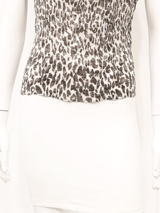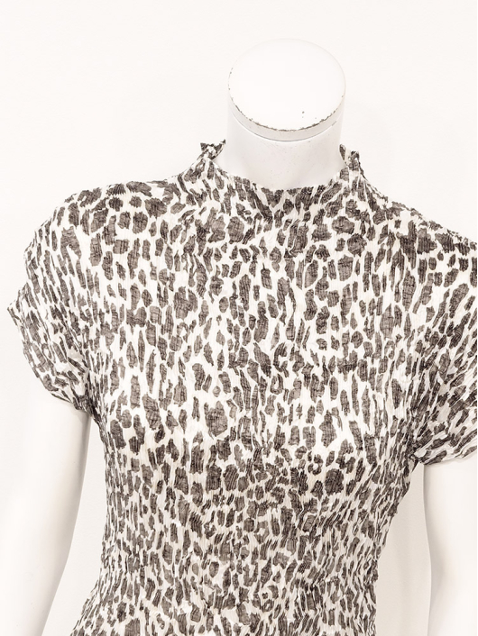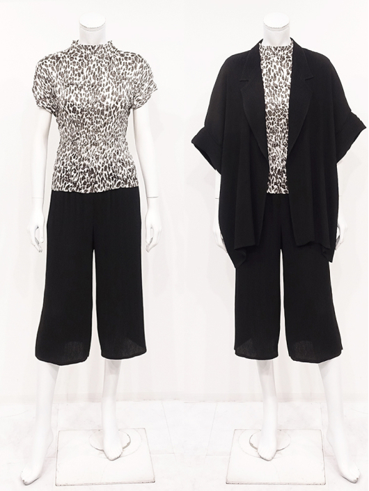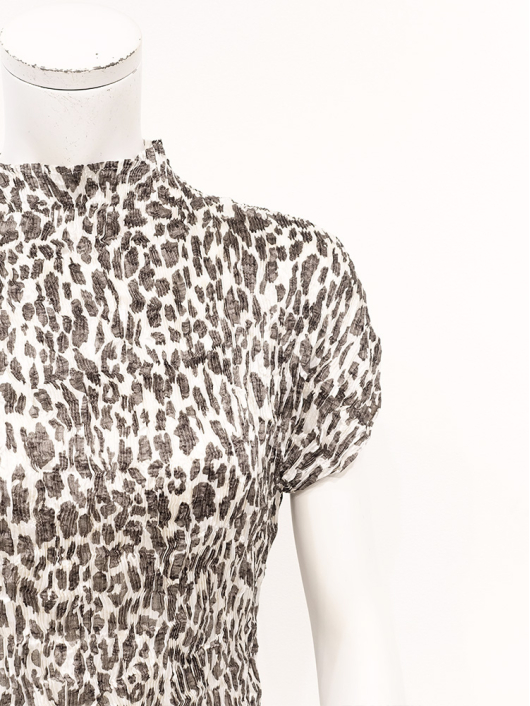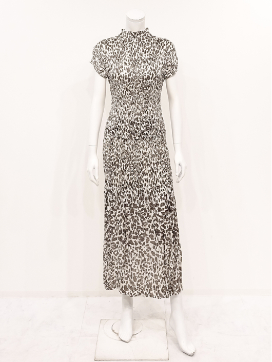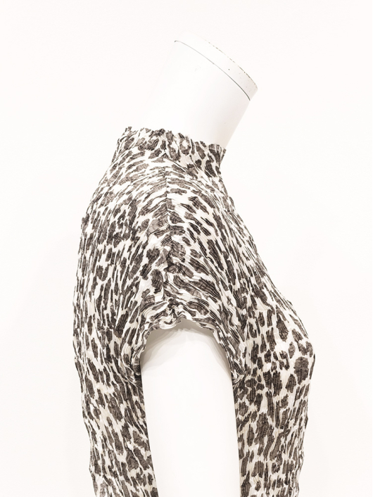 軽やかに日常と非日常を行き来できるクリスタルクラッシュプリーツトップス。着るだけで「身体のラインを綺麗に見せてくれる」ミニマルなシルエットに、透明感のあるヒョウ柄をアクセントにプラス。1枚で絵になるモダンなニュアンスはパーティシーンにもおすすめ。