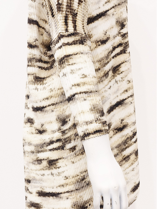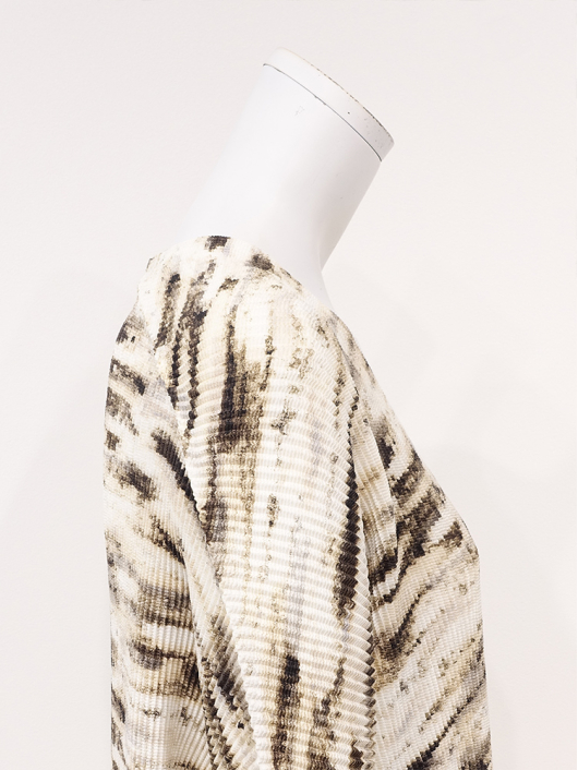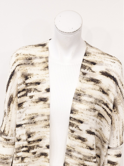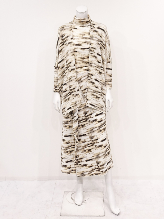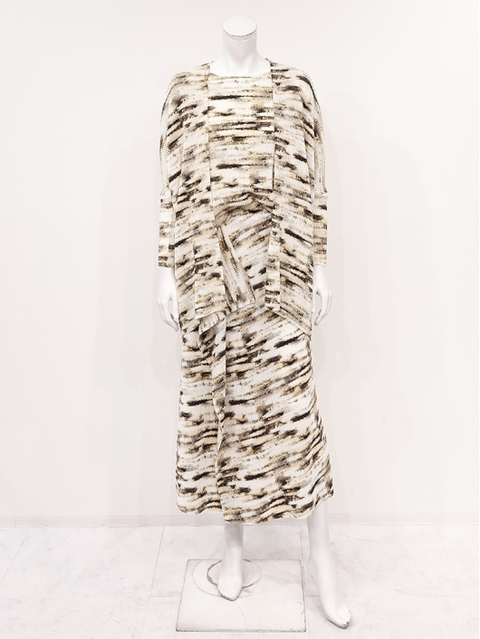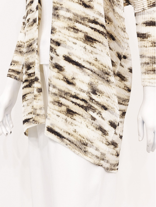 春の気配を感じる日差しの暖かさや冬から春へと移ろう季節を抽象的に表現した明るい色合いが魅力的なミックスカラーボーダーのぼかし柄プリントで定番人気のコクーンスリーブジャケットをブラッシュアップ。