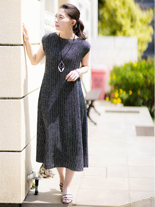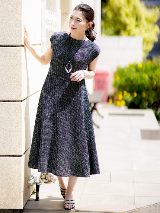 きれいなシルエットがスタイルに映えるサンドレス。ほんの少し鎖骨の見える襟ぐりや ウエストをややシェイプし 裾にかけて広がっていく 流麗なテントラインに、ドレッシーな印象のロング丈で女性らしさを意識しています。1枚でスタイルが決まる主役級のワンピースは、デイリーにはもちろん、お呼ばれや帰省/旅先のドレスアップにもおすすめの1枚です。
