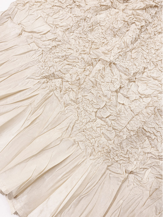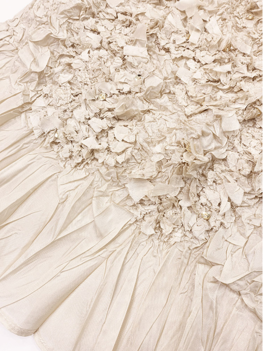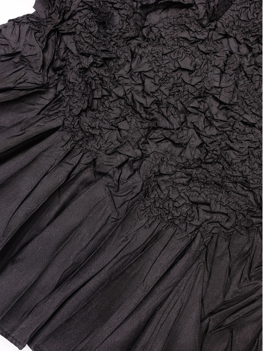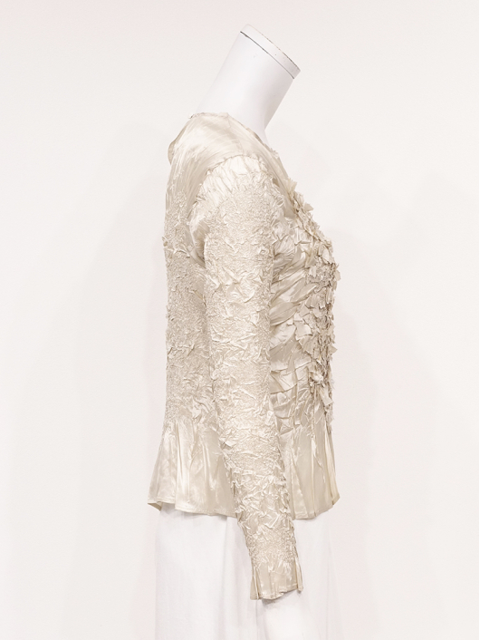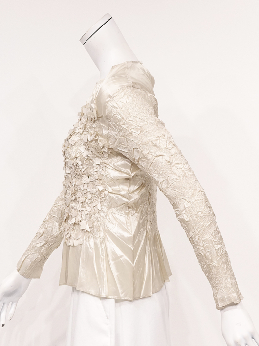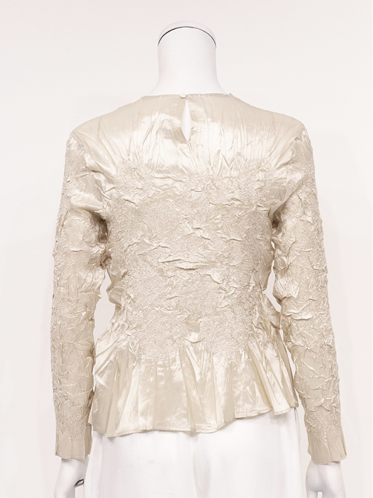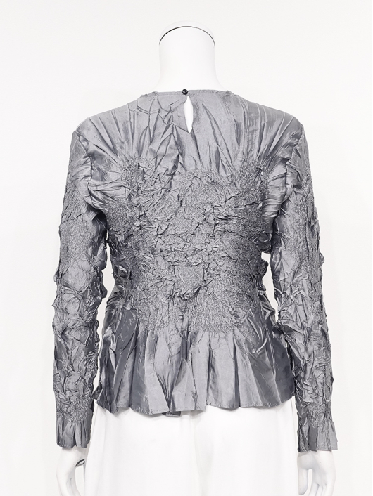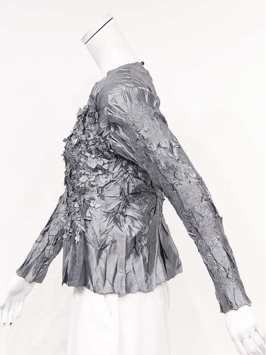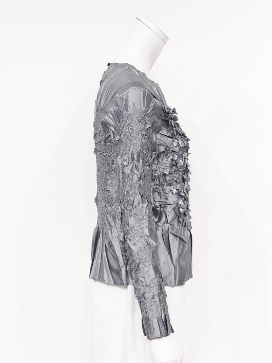 圧倒的なアーティ感が見た目にも美しいGプリーツの長袖トップス。肌見せを抑えた上品な印象のミニマルなネックラインとフロントを大胆に飾る刺繍にさりげなくクールなきらめきを取り入れているのも細やかで心憎い演出。ドレッシーにもカジュアルダウンにもバランスが取りやすいクチュールライクな存在感はドレススタイルより印象的に決まります。デイリーのちょっとしたドレスアップはもちろん、オケージョンにも使い勝手の良い1枚です。