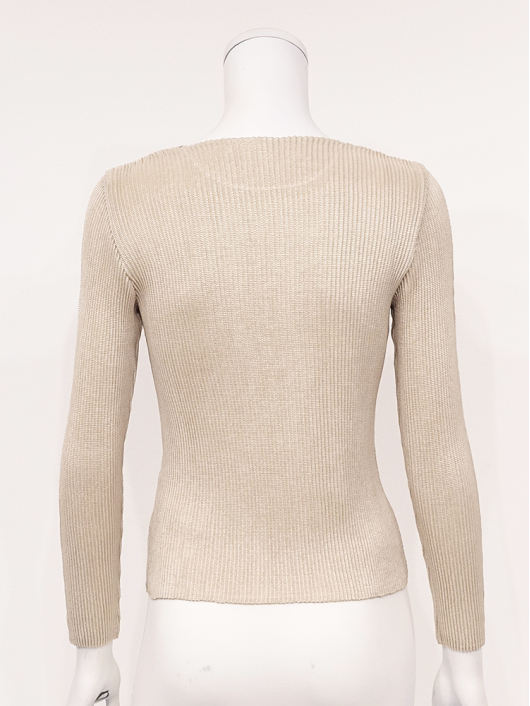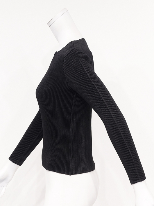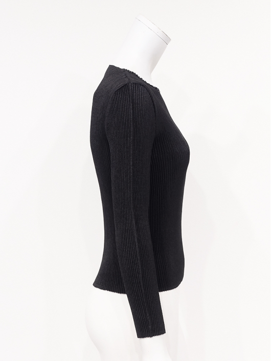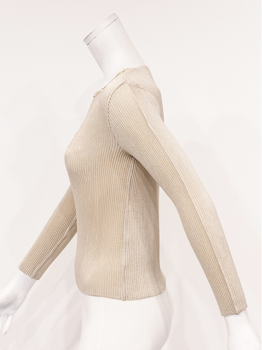 ネックラインにキラキラと瞬く刺繍のラインアクセントが魅力的なラウンドネックの9分袖トップス。