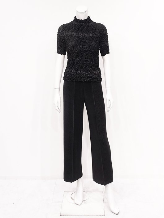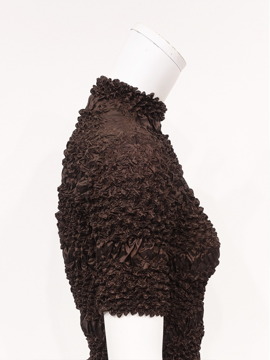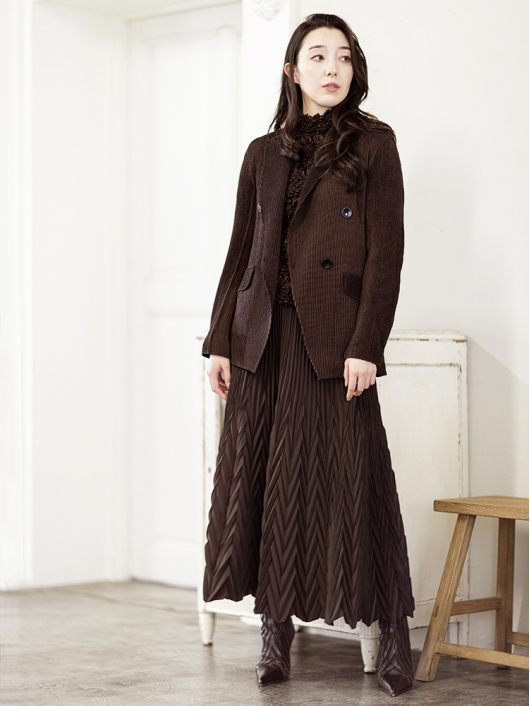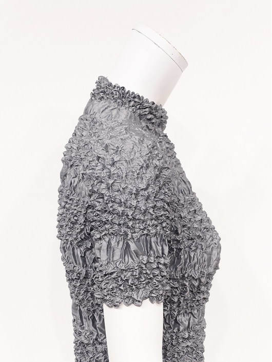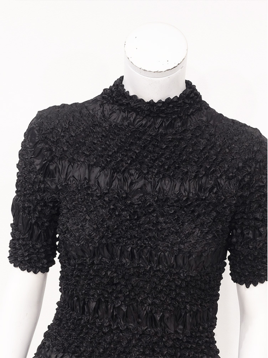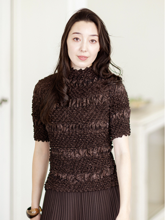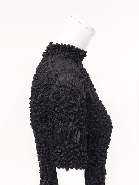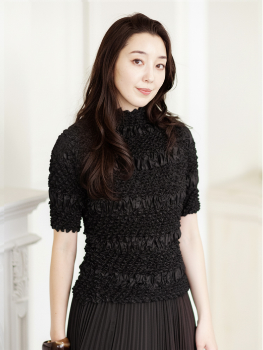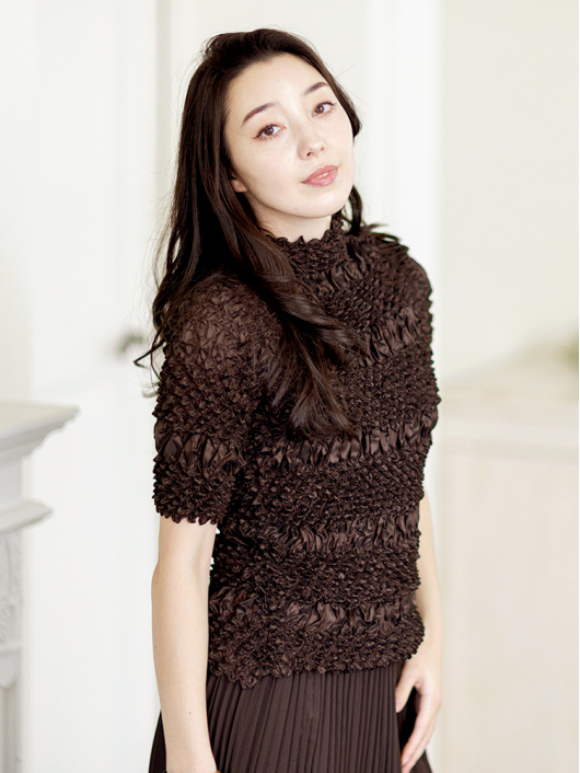 360°どこから見ても絞りの凹凸が映え、優しく体にフィットしてくれるシルエットに、すっきりとしたミニマルなモックネックやショート丈の腰回り。ボリューム感のあるスカートやワイドパンツとの相性も抜群です。シンプルなコーディネートに映えるトップスとしてはもちろん、ジャケットやロングベストなどのインナー使いにおすすめです。