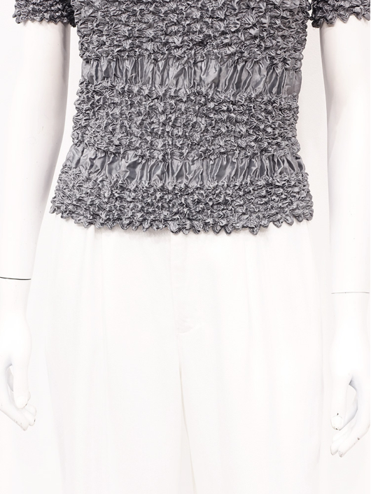 糸で布を巻き上げることで模様を表す"巻き上げ絞り"の伝統的な技法を施したボーダー柄の半袖トップス。唯一無二のアーティスティックな雰囲気が魅力的です。