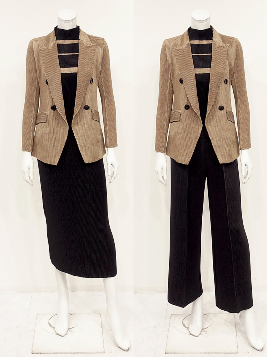 シャトルプリーツ ピークドラペル ダブルブレスト ジャケット ¥19,800 1080ポイント還元 お気に入り登録数:17人 01 | 18 ツイード柄(黒白系) ズーム ※選択中のカラーの商品情報が表示されます シャンブレーブラウン キャメル シャンブレーブラウン Free/3~31号 ○ カートに入れる キャメル Free/3~31号 ○ カートに入れる 商品説明 気取りなくさらりと羽織るだけでオフィス映えはもちろん、ちょっとお出かけするときも、きちんと見える「スタイリッシュな大人のジャケット」に新色ブラウンが新登場! トレンドのピークドラペルに、身幅に程良くゆとりを持たせたダブルブレストデザインと、メンズライクなルックスを持ちつつ高め位置でウエストをやや絞った女性らしいシルエットが魅力です。すっきりと端正な印象を演出してくれるロング丈で着こなしやすさはもちろん、シルエットの邪魔にならないよう左右にフラップポケットを配して、かっちりしすぎない大人のモードスタイルに。トップスの上にさらりと羽織るだけで、ラフに前を開けても 締めても 颯爽とした着こなしがサマになります。 ◆お揃いになるパンツを合わせて凜とした佇まいでスタイリッシュに着こなせるスーツスタイルはもちろん、ロングタイトスカートを合わせて王道をいくクラシカルなレディスタイルやカジュアルなデニムスタイルにもよく似合うピークドジャケットは、ボトムス次第でマニッシュにもエレガントにも演出できる着映え力の高い仕上がり。インナーやアクセサリーを華やかにして大切な日に華を添える大人の「晴れの日」スタイルとしてもきちんと着回して使える上質なベーシックデザインが素敵ですね。 商品詳細 プリーツの種類:シャトルプリーツ対応サイズ:Free/3~31号重さ:308g生産国:中国素材:ポリエステル100%取り扱い:ドライ商品品番:452-455-40-04 商品の特徴 サイズガイドはこちら 【サイズ:平置き寸】 バスト88 肩幅38 袖丈55 着丈62 ※単位:cm 【サイズの詳細:着用寸】 バスト:74~124cm(対応サイズ)・肩幅:39cm・袖丈:57cm・着丈:64cm 【商品の仕様】 ・シャトルプリーツ製品 (縦横斜め全方向に伸縮性があります) ・ピークドラペルカラー ・前ボタン、内掛けボタン開き ・ダブルブレスト ・セットインスリーブ ・前2個ポケット付き ・ボックスシルエット ・前下がり裾仕様 ・長め丈(ヒップが半分隠れるくらいの丈感) ・背裏仕立て ◆セットアップ対応◆ お揃いになるパンツやトップスと合わせてツーピース / スリーピーススーツとしての着用が可能です。ビジネスからセレモニー / パーティフォーマルまで幅広い用途に活躍するアイテムです。 ◆Coordinate ・ちょっとしたお出かけにはシンプルなトップスと裾にアクセントを効かせたアコーディオンプリーツスカートと合わせて軽やかに。 ・お揃いになるワンピースとも相性が良く、デイリー使いはもちろん、オフィスでさりげなく華やぐスタイリングが叶います。 ・その他にも、相性の良いアイテムを揃えていますので多彩なクロスコーディネートを自由にお楽しみ頂けます。 *セットアップ対応商品は在庫切れの場合がございます。。 【商品に対するご注意】 ※着用・お取り扱いの際は、商品についている品質表示とアテンションタグを必ずご確認下さい。 ※ゆとり感には個人差があります。サイズ表を確認の上、ご購入の目安としてご利用ください。 ※プリーツの形状や生地 / 仕様・デザインにより、着用感や実際のサイズ表に若干の誤差が生じる場合がございます。予めご了承ください。 ※単品の画像がない洋服/小物はスタイリングアイテムです。セットではないので、予めご了承下さい。 ※モデル撮影画像は、光の当たり具合で色味が違って見える場合があります。商品の色味はトルソー撮影の画像をご参照ください。 ※メーカー希望小売価格:¥19,800(税込) 商品説明 気取りなくさらりと羽織るだけでオフィス映えはもちろん、ちょっとお出かけするときも、きちんと見える「スタイリッシュな大人のジャケット」がシャトルプリーツに新登場! トレンドのピークドラペルに、身幅に程良くゆとりを持たせたダブルブレストデザインと、メンズライクなルックスを持ちつつ高め位置でウエストをやや絞った女性らしいシルエットが魅力です。すっきりと端正な印象を演出してくれるロング丈で着こなしやすさはもちろん、シルエットの邪魔にならないよう左右にフラップポケットを配して、かっちりしすぎない大人のモードスタイルに。トップスの上にさらりと羽織るだけで、ラフに前を開けても 締めても 颯爽とした着こなしがサマになります。 ◆お揃いになるパンツを合わせて凜とした佇まいでスタイリッシュに着こなせるスーツスタイルはもちろん、ロングタイトスカートを合わせて王道をいくクラシカルなレディスタイルやカジュアルなデニムスタイルにもよく似合うピークドジャケットは、ボトムス次第でマニッシュにもエレガントにも演出できる着映え力の高い仕上がり。イ