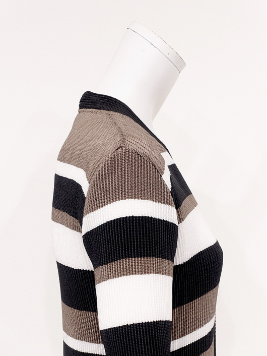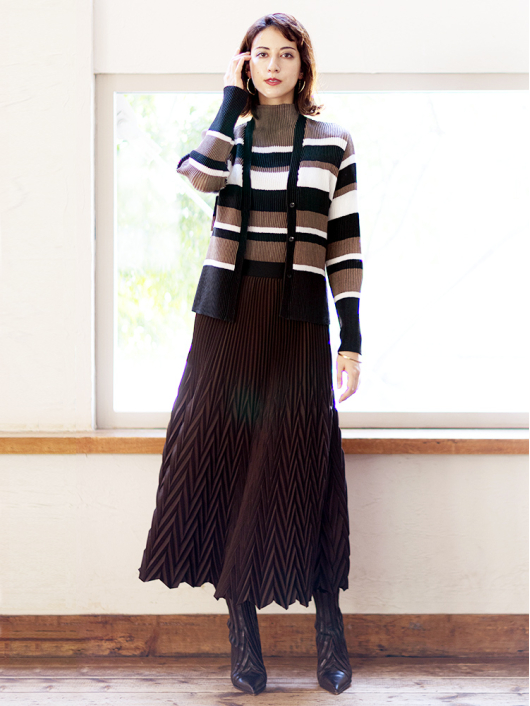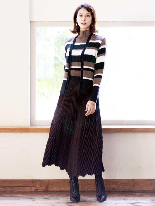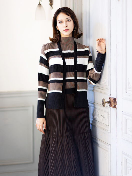 シャトル Vネックカーディガン ¥17,600 480ポイント還元 お気に入り登録数:0人 01 | 18 ツイード柄(黒白系) ズーム ※選択中のカラーの商品情報が表示されます モカムース×オフホワイト×ブラック モカムース×オフホワイト×ブラック Free/3~31号 △ カートに入れる 商品説明 カジュアルからきれいめまで着こなせるシャトルのVネックカーディガン。シンプルなコーディネートに取り入れやすいマルチボーダーアクセントは、洗練された色合いのモカムースを主役に白黒配色で上品にまとめています。 胸元をすっきりと見せてくれるVネックラインに、身体に馴染みながらもラインを拾いすぎない程よいシルエット、やや短めの丈はトレンド感があり、スラリと見える効果もプラス。軽やかな着心地でロングシーズン着まわせるのはもちろん、テクニックが必要なくサラッと羽織るだけで主役級の存在感を放つ一枚は大人の日常着にもぴったり。 商品詳細 プリーツの種類:シャトルプリーツ対応サイズ:Free/3~31号重さ:180g生産国:中国素材:ポリエステル100%取り扱い:ドライ商品品番:452-471-40-54 商品の特徴 サイズガイドはこちら 【サイズ:平置き寸】 バスト82 肩幅35 袖丈55 着丈52 ※単位:cm 【サイズの詳細:着用寸】 バスト:74~124cm(対応サイズ)・肩幅:39cm・袖丈:58cm・着丈:52cm 【商品の仕様】 ・シャトルプリーツ製品 (縦横斜め全方向に伸縮性があります) ・マルチボーダー柄プリント(モカムース×オフホワイト×ブラック) ・Vネックライン ・前中心ボタン開き ・セットインスリーブ ・長袖 ・ヒップにかかるくらいの丈感 ◆Coordinate ・お揃いになるスヌードやプルオーバーとのセットアップもとても素敵です。 ・ちょっとしたお出かけにはプリーツアクセントを効かせたアコーディオンスカートと合わせて軽やかに。 ・きちんと感のあるボトムスとも相性が良く、オフィスでさりげなくモードなスタイリングが叶います。 ・その他にも、相性の良いアイテムを揃えていますので多彩なクロスコーディネートを自由にお楽しみ頂けます。 *セットアップ対応商品は在庫切れの場合がございます。 【商品に対するご注意】 ※着用・お取り扱いの際は、商品についている品質表示とアテンションタグを必ずご確認下さい。 ※ゆとり感には個人差があります。サイズ表を確認の上、ご購入の目安としてご利用ください。 ※プリーツの形状や生地 / 仕様・デザインにより、着用感や実際のサイズ表に若干の誤差が生じる場合がございます。予めご了承ください。 ※単品の画像がない洋服 / 小物はスタイリングアイテムです。セットではないので、予めご了承下さい。 ※モデル撮影画像は、光の当たり具合で色味が違って見える場合があります。商品の色味はトルソー撮影の画像をご参照ください。 ※メーカー希望小売価格:¥17,600(税込) このアイテムを使ったコーディネート 身長:167cm