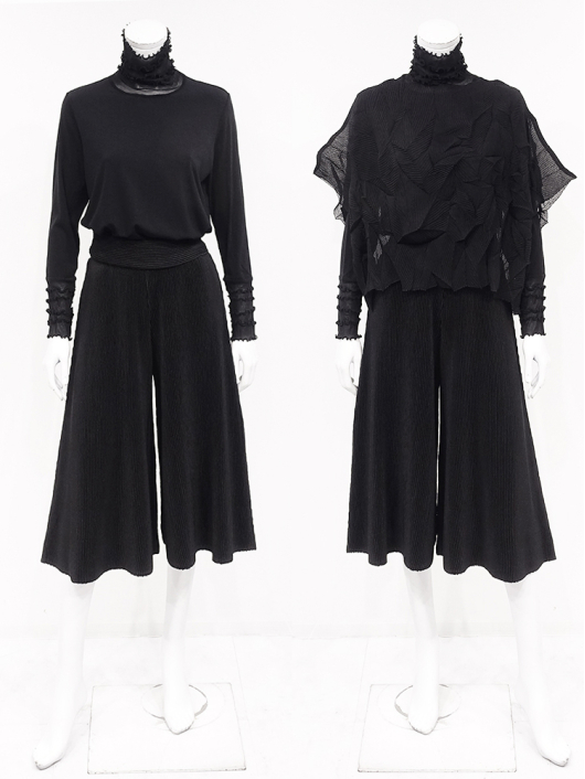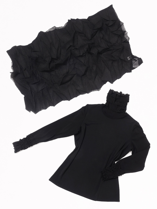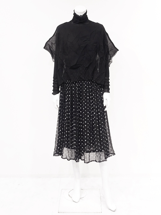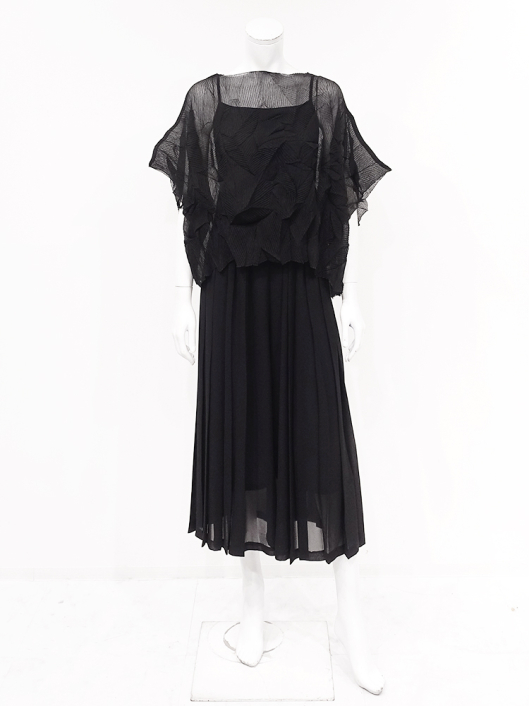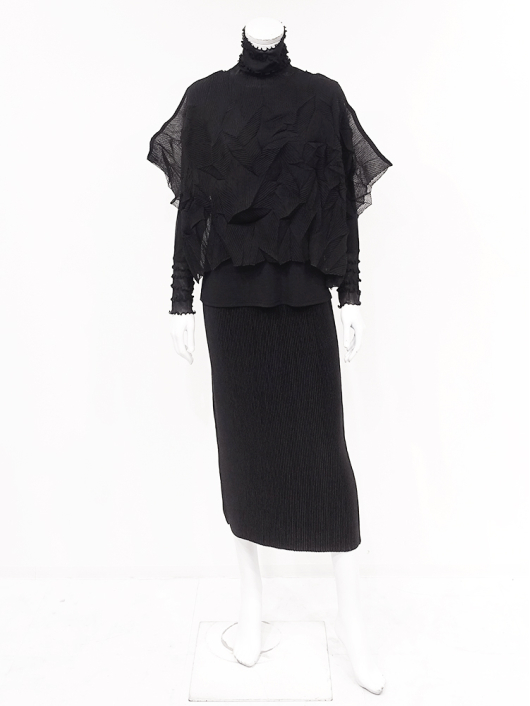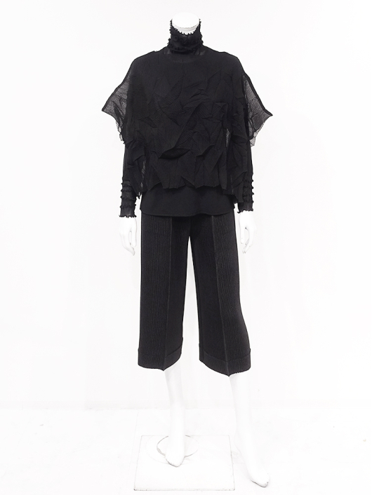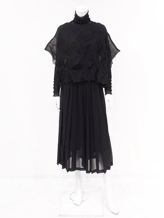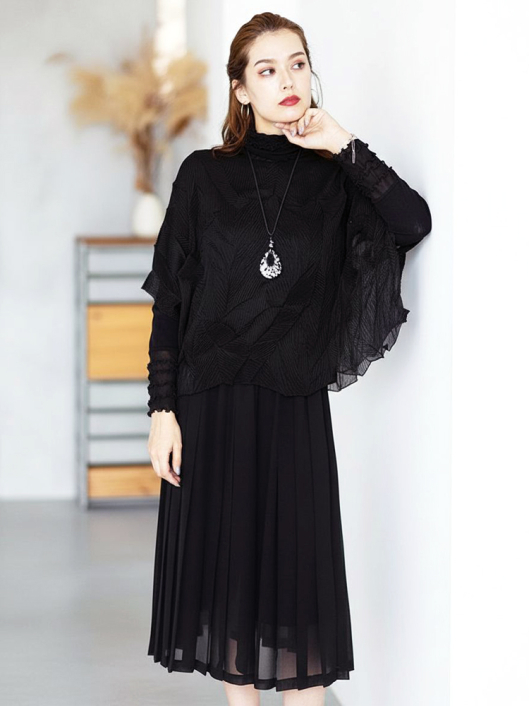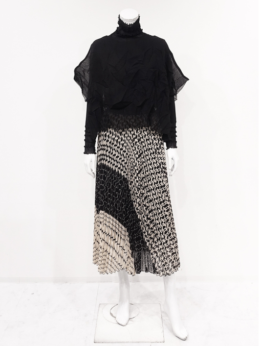 ツイントップス(シフォンプリーツショートトップス+メロープルオーバー) ¥16,500 450ポイント還元 お気に入り登録数:10人 01 | 18 ツイード柄(黒白系) ズーム ※選択中のカラーの商品情報が表示されます ブラック ブラック 40 ○ カートに入れる 商品説明 きれいめにもカジュアルにも取り入れやすい異素材使いのレイヤーニュアンスをモードな雰囲気にまとめた おしゃれなツイントップス。 アウターはエアリーな楊柳シフォン素材。精密でいて縦横無尽に表面変化をつけた楓プリーツをたっぷり施し、くだけすぎず、きちんと着映えして見えるオーバーサイズのショートトップスデザイン。インナーのプルオーバーは、衿と袖口で切り替えて魅せるソフトパワーネット素材のメロウフリルデザイン。本体は着心地の良いスムースジャージー仕様。1枚でさらりと着るだけでもサマになり、レイヤードスタイルのインにも使える着まわし力抜群のベーシックアイテムです。 ◆コーディネートに悩んだときにも頼りになるツイントップスは、型にはまらない独創的なエレガンス感も魅力的。それだけで着こなしがサマになる 着映え力の高いデザインなので、華やかなディナーの席にも旅先でのドレスアップにもおすすめの1枚です。 商品詳細 プリーツの種類:楓葉乱プリーツ(アウターのみ)対応サイズ:アウター / 3~31号・インナー / 40号重さ:254g生産国:中国素材:ポリエステル100%(アウター) 別布:ポリエステル95% ポリウレタン5%(インナー) 別布:ナイロン100%(インナー襟・袖・袖口部分)取り扱い:アウター / 手洗いのみ・インナー / ドライ商品品番:452-705-40-09 商品の特徴 サイズガイドはこちら 【サイズ:平置き寸】 アウター 身幅約70 裄丈約36 着丈約45 インナー バスト98 肩幅37 袖丈60 着丈62 ※単位:cm ■サイズの詳細・着用寸:ツイントップスセット(3WAY仕様 / 単品使いも出来ます) アウター:バスト74~124cm(対応サイズ)・裄丈45cm・着丈47cm・重さ72g インナー:バスト98・肩幅39cm・袖丈60cm・着丈62cm・重さ182g 【商品の仕様】 ◆アウター ショートトップス / ブラック色 ・楓葉乱プリーツ製品(縦横無尽に表面変化をつけた楓の葉のような形の立体感を持つ不規則なプリーツ形状も特徴のひとつ / 縦横斜め全方向に伸縮性あり) ・楊柳シフォン素材(透け感があります) ・ボートネックライン ・ドロップショルダー ・オーバーシルエット ・ウエストラインがやや隠れるくらいの丈感 ・着用時は身頃のサイドが自然に下がるイレギュラーヘムライン ・全て手作業で丁寧に仕上げているため、一枚毎に表情が異なります。 ◆インナー プルオーバー / ブラック色 ・異素材切り替えデザイン ・本体スムースジャージー素材 ・衿と袖口はソフトパワーネット素材(メロウフリル仕様 / 透け感があります) ・ハイスタンドネック ・セットインスリーブ ・長袖 ・ヒップが半分隠れるくらいの丈感 ・デザインの特性上、インナーカットソーの対応サイズは40号になりますのでご了承ください。 【商品に対するご注意】 ※着用・お取り扱いの際は、商品についている品質表示とアテンションタグを必ずご確認下さい。 ※ゆとり感には個人差があります。サイズ表を確認の上、ご購入の目安としてご利用ください。 ※素材の特性や仕様 / デザインにより、着用感や実際のサイズ表に若干の誤差が生じる場合がございます。予めご了承ください。 ※単品の画像がない洋服 / 小物はスタイリングアイテムです。セットではないので、予めご了承下さい。 ※モデル撮影画像は、光の当たり具合で色味が違って見える場合があります。商品の色味はトルソー撮影の画像をご参照ください。 ※メーカー希望小売価格:¥16,500(税込) このアイテムを使ったコーディネート 身長:171cm