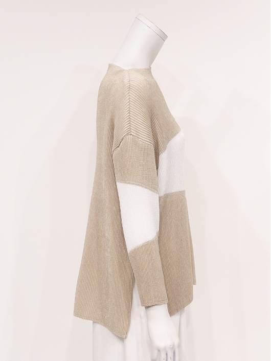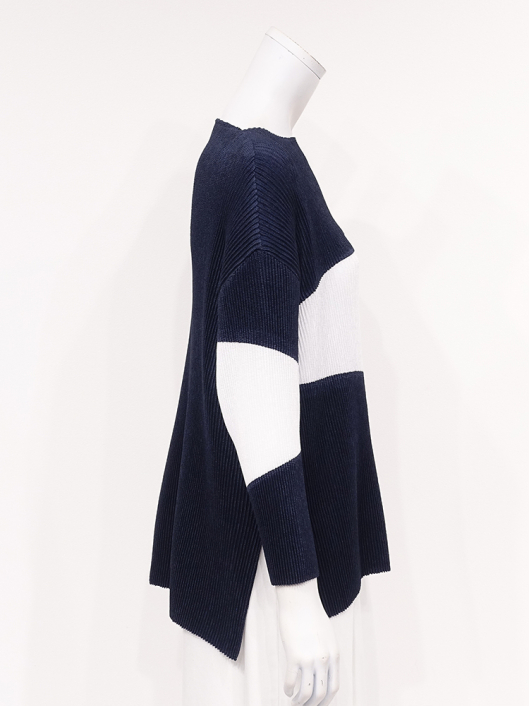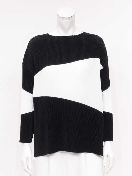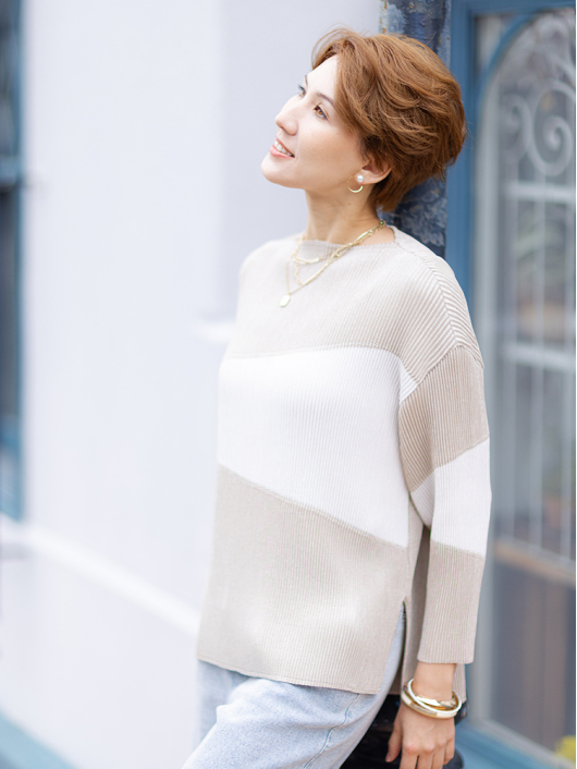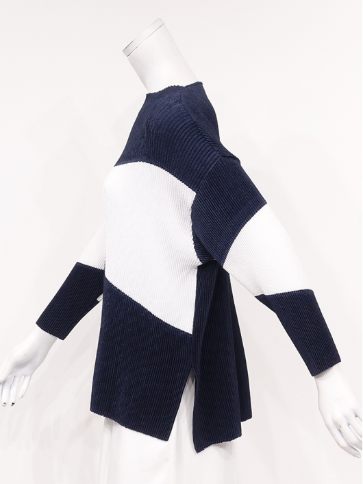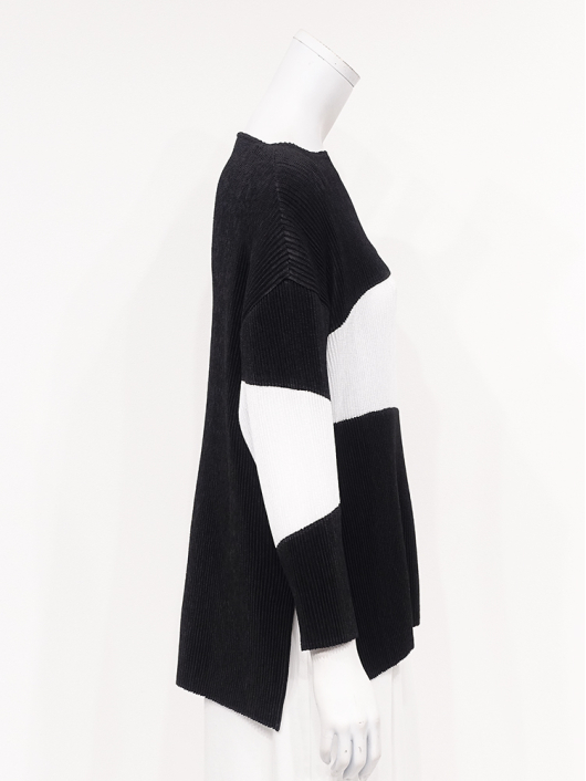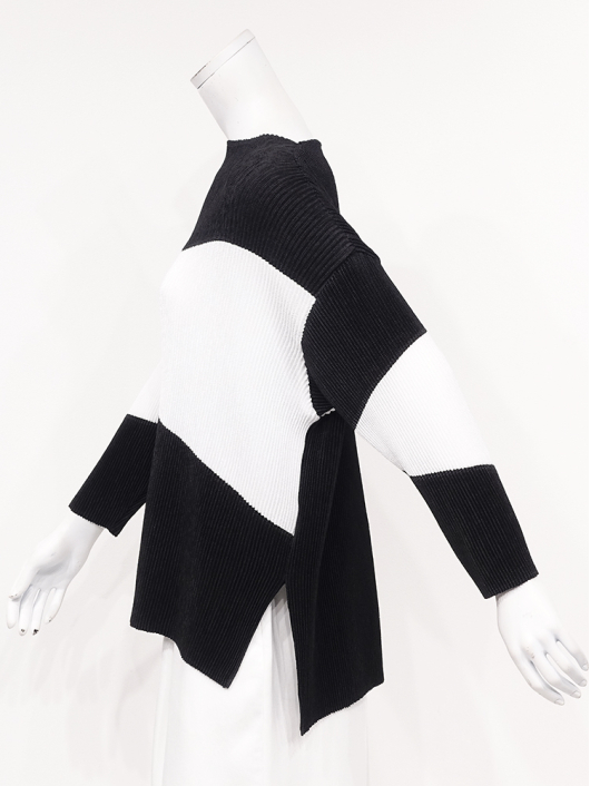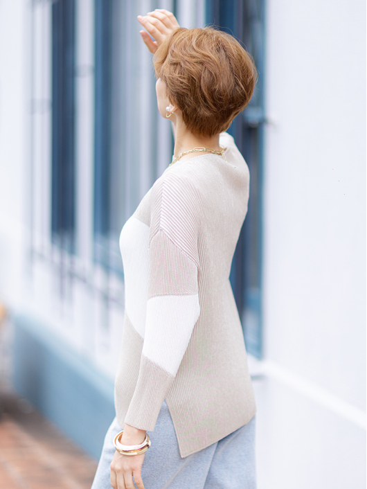 ゆったりとしたドロップショルダーシルエットに、一枚で絵になるモード感を添えたカラーブロックデザインのプルオーバーチュニック。目眩まし効果も狙えるバイカラーの印象的なアクセントや、潔く肌見せをおさえたボートネック、テクニック要らずで上級見えする身体を束縛しないシルエット等、デイテールはシンプルに徹することで着こなしやすい上にスタイルアップが叶う一枚に仕上げています。前後差のある裾のスリットもさりげないポイント。