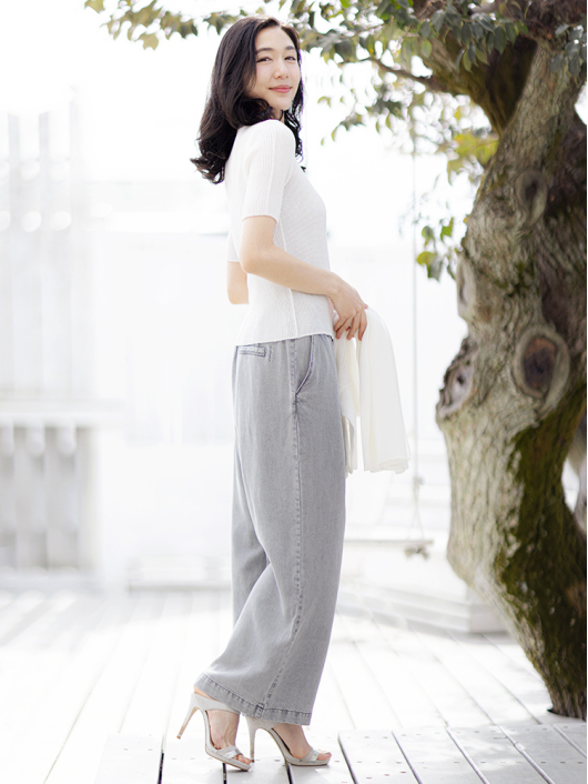 女性らしい抜け感でネックラインや鎖骨をソフトに魅力的に引き立たせくれる半袖のラウンドネックプルオーバー。少し肌寒く感じる今の時期、春を纏うトップスとして、届いたらすぐ着られるのも丁度いいアイテム。普段使いにも気軽に取り入れやすく、オフィスでも浮かないきちんと感を備えています。お揃いになる定番ジャケットやボトムスとのセットアップはもちろん、ロングのナロースカートでエレガントでありながらシックな印象に着こなしたり、フレアパンツやタフタ素材のボリュームスカートを合わせて軽快なスタイリングも新鮮。程よいフィット感でスタイルをキレイに見せてくれるシンプルなシルエットなので着まわせる時期も長く、オケージョンに応じたスタイリングが楽しめるのも魅力です。