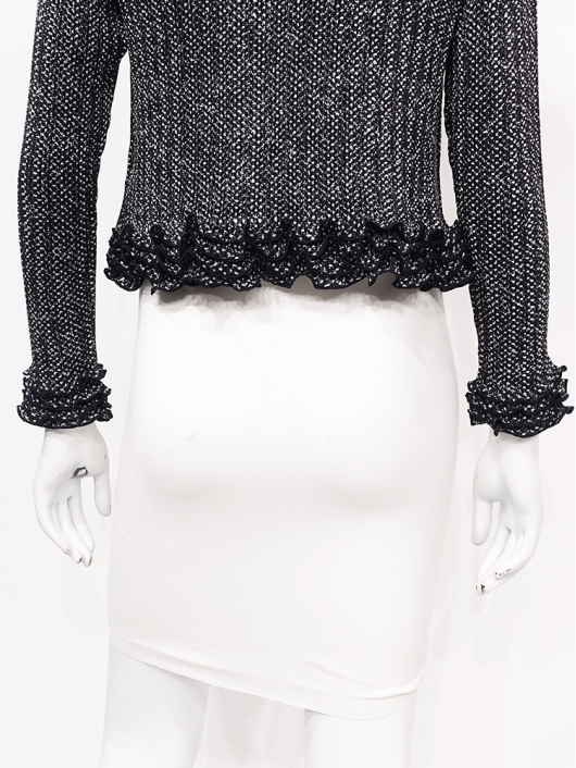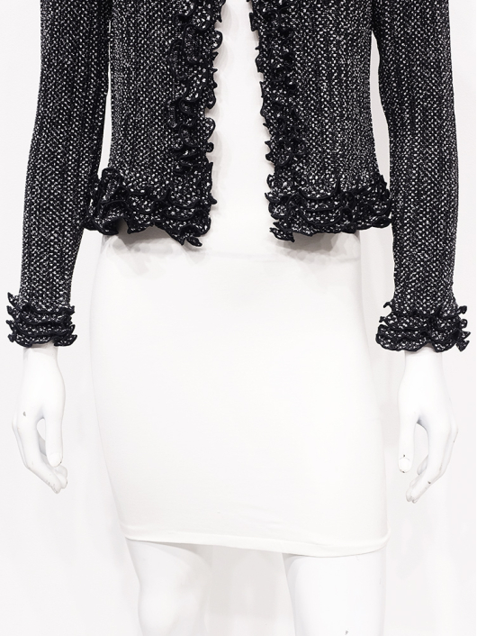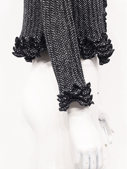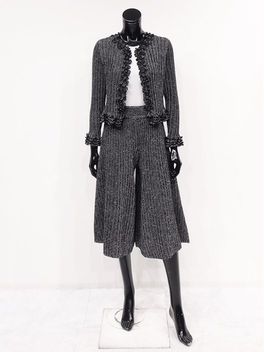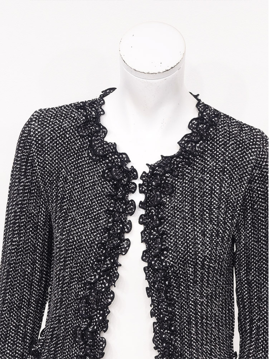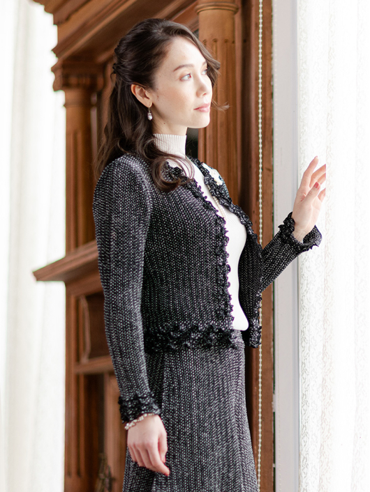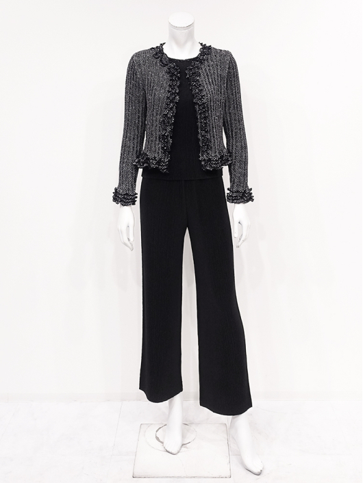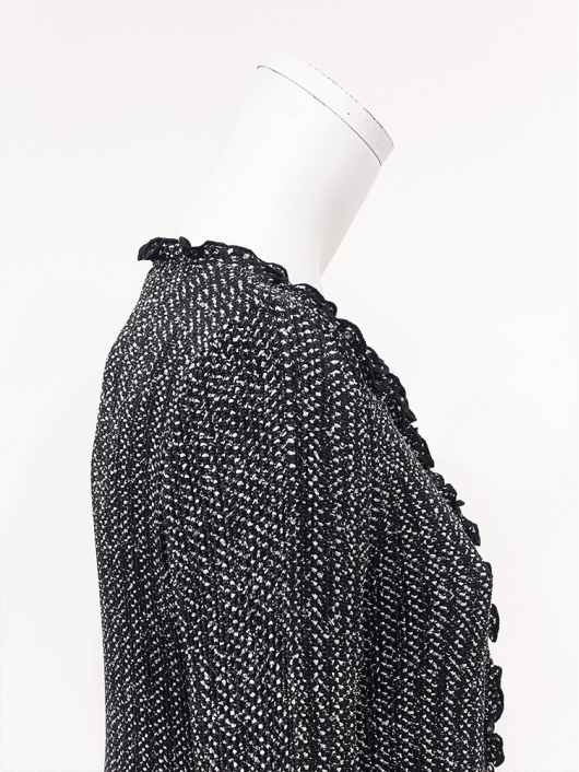 エレガントな印象に大人っぽく仕上げたノーカーラーのティアードフリルジャケット。形はキレイめ、甘くなりすぎず、メロウフリルの量感がスタイルを上品に演出してくれます。丈感やシルエットがコンパクトなので、ラフに羽織るだけでも トレンドのクラシックなニュアンスの装いはもちろん、きちんと感のあるワイドパンツやカジュアルなデニムスタイルにもフィット。