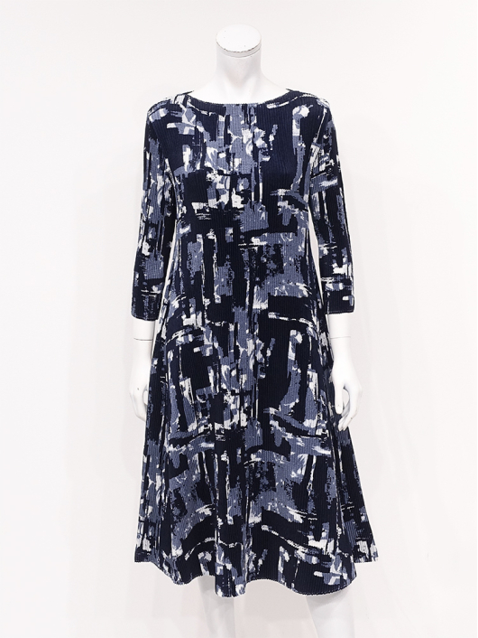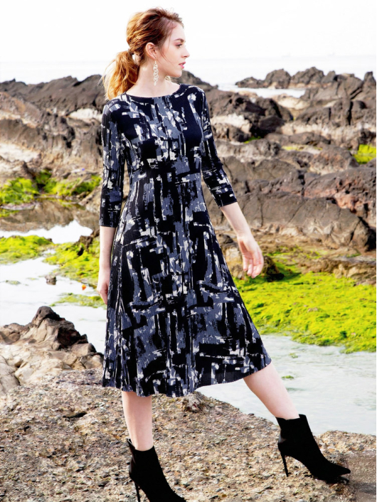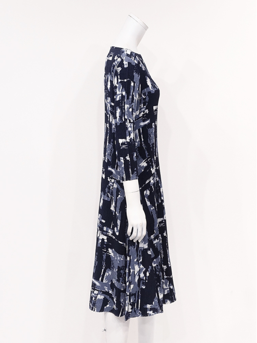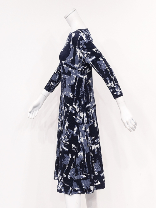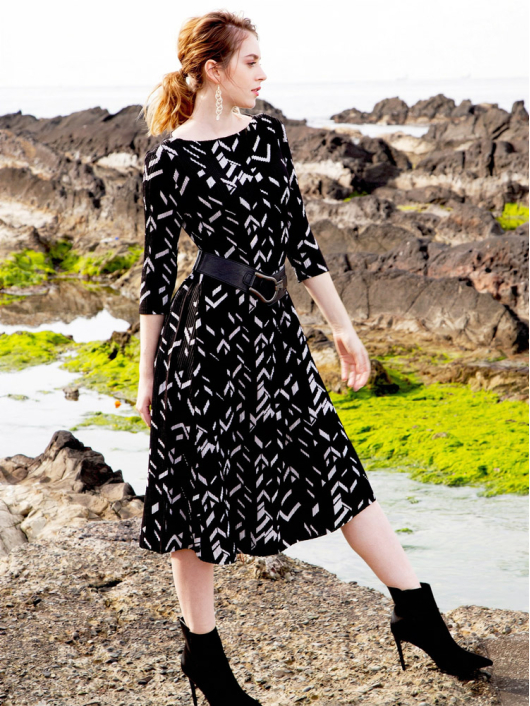 ボディラインに付かず離れずの緩やかなシルエットで、1枚できれいに着こなせるプリントワンピース。あえてカジュアルに着こなしたいインパクトのあるポップな幾何学柄で誰よりも素敵に!